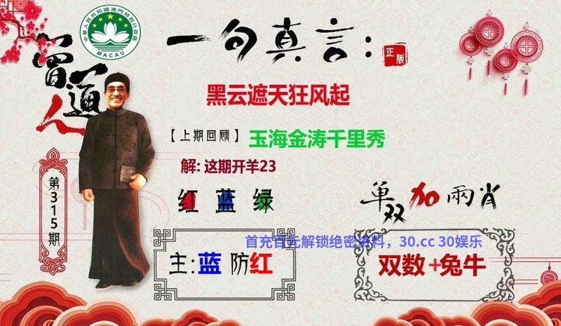 315期【解一句真言】:黑云遮天狂风起,黑云遮天,解黑肖猴羊马蛇龙兔 王牌看好波色:蓝波+红波 王牌看好单双:双数+兔牛 |
